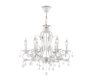 Металлическая арматура в двух оттенках: латунь и никель. Классическая форма плафона в виде свечи. Торшер и настольная лампа имеют тканевые абажуры. Белые – для арматуры цвета никель, оттенка кремовый шампань – для латунной. Декор – прозрачные хрустальные подвесы каплевидной формы. Торшер с цоколем Е27, лампа, бра и люстры – Е14.