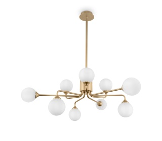 Материал арматуры – металл. Цвет – хром. Абажуры из полупрозрачной органзы серебристого оттенка. Декор – хромированные шары. Высота люстр регулируется. Одиночный подвес с цоколем Е27, лампа, бра, торшер и люстры – Е14.