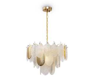 Металлическая арматура. Цвет – французское золото. Декор – рельефные лепестки двух видов: в тон арматуре и из прозрачного фактурного стекла. Современная интерпретация флористического дизайна. Источник света – лампа с цоколем Е14.