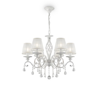 Арматура из металла в жемчужно-белом цвете. Кремовый абажур из плиссиро ванной органзы, окантовка золотистой тесьмой. Абажур заключен в металличе ский каркас. Флористический декор.