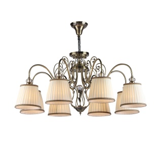 Металлическая арматура в цвете античной бронзы. Белые абажуры из органзы изготовлены в технике намотки, декорированы тесьмой. Декор – граненые кри- сталлы. Крепление 2 в 1 – монтаж с цепью и без нее. Регулируемая высота подвесных светильников. Источник света — лампа с цоколем Е14.