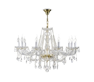 Металлическая арматура золотого цвета. Рожки – витое прозрачное стекло. Рельефный стеклянный декор обрамляет контуры светильника. Подвески из крис таллов различных форм и огранки.