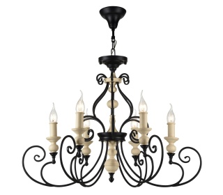 Арматура – металл, оттенки – белый, черный. Декор – полирезин, оттенки – серый, бежевый. Источники света в форме свечей. Крепление 2 в 1 – на крюк или планку.