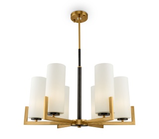 Арматура из металла, оттенок — латунь. Стеклянные плафоны в белом цвете. Часть элементов окрашена в контрастный черный оттенок. Геометрия в дизайне: цилиндрические плафоны, прямоугольные рожки.