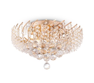 Металлическая арматура, оттенки – латунь, белый с золотом. Модели с открытыми источниками света и с абажурами. Абажуры из органзы, оттенки – бежевый, белый. Закрученный по спирали декор центральной оси. Подвески из кристаллов. — Высота люстр регулируется. Источник света — лампа с цоколем Е14.