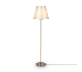Арматура из металла в двух оттенках: матовое золото и латунь. Абажуры – текстиль на ПВХ бежевого оттенка. Часть абажуров в серии декорирована узорным кантом, часть – атласным кантом в тон арматуре. Торшер с цоколем Е27, лампа, бра и люстры – Е14.