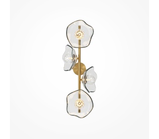Арматура – металл + стекло, цвет — золото. Универсальные тканевые абажуры в белом цвете. Декоративные элементы из прозрачного рельефного стекла. Источник света — лампа с цоколем Е27.