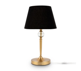 Металлическая арматура в цвете латунь. Дополнительные элементы — минималистичные вставки из натурального белого мрамора. Белые абажуры из ткани в форме конуса. Источник света — лампа с цоколем Е14 или Е27.