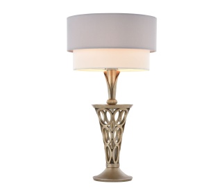 Арматура из металла в золотом цвете. Кремовый абажур из хлопка на ПВХ. Декор абажура – металлический каркас с просечным орнаментом. Источник света — лампа с цоколем Е27.