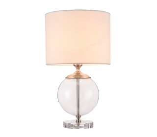 Арматура – металл, оттенки – латунь, хром. Двойной абажур, текстиль 2 видов: лен, полупрозрачная органза. Прозрачные элементы: выдувное стекло, литой акрил в основании.