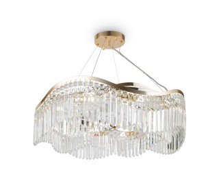 Металлическая арматура. Оттенки – латунь, хром. Оригинальный разноразмерный декор с эффектом замороженной фактуры. Материал декора – стекло. В качестве источников света используются лампы с цоколем Е14.