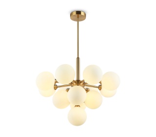 Металлическая арматура, цвет — черный + латунь. Стеклянные плафоны в двух оттенках — матовый белый или дымчатый. Направление плафонов в разные стороны позволяет распределить свет максимально равномерно. Источник светал — лампы с цоколем G9.