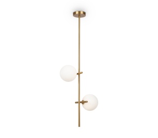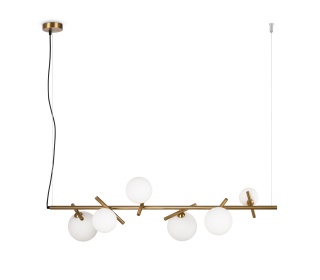 Материал арматуры — рифленый металл, цвет — латунь. Плафоны-сферы из белого матового стекла для мягкого заливающего света. Воздушный образ плафонов, строгие тонкие линии арматуры придадут интерьеру изящество и легкость. Высота подвесов регулируется. Источник света — лампы с цоколем G9.