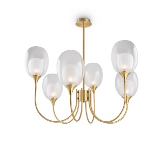 Металлическая арматура, цвет – латунь. Плафоны – двойное выдувное стекло. Внутренняя часть – матовая, внешняя – прозрачная. Элегантная неоклассика, трендовые округлые формы.
