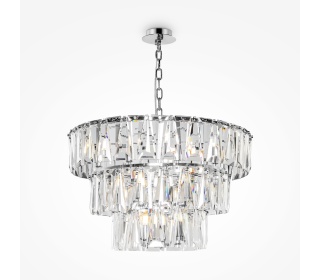 Материал арматуры – металл, оттенки – хром и золото. Декор – массивные крис таллы сложной огранки. Высота подвесных моделей регулируется длиной цепи. Источник света — лампа с цоколем Е14.