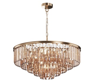 Арматура из металла в трех оттенках: латунь, хром, золото. Многоярусный декор. Подвески: прозрачное (арматура – хром, латунь) и янтарное (арматура – золото) стекло. Высота подвесных моделей регулируется.
