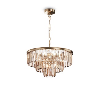 Арматура из металла в трех оттенках: латунь, хром, золото. Многоярусный декор. Подвески: прозрачное (арматура – хром, латунь) и янтарное (арматура – золото) стекло. Высота подвесных моделей регулируется.