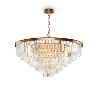 Арматура из металла в трех оттенках: латунь, хром, золото. Многоярусный декор. Подвески: прозрачное (арматура – хром, латунь) и янтарное (арматура – золото) стекло. Высота подвесных моделей регулируется.