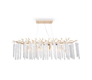 Арматура из металла, цвет – хром. Хрустальный декор двух видов: крупный вытянутый по внешнему периметру и округлый на подвесках. Высота подвесных моделей регулируется. Цоколь Е14.