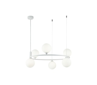 Металлическая арматура, оттенки – никель, латунь. Плафоны – выдувное стекло белого цвета. Широкая семья. У торшера и настольной лампы можно изменять положение плафона. Регулируемая высота.