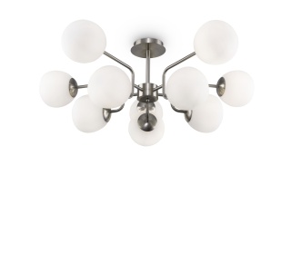 Металлическая арматура, оттенки – никель, латунь. Плафоны – выдувное стекло белого цвета. Широкая семья. У торшера и настольной лампы можно изменять положение плафона. Регулируемая высота.