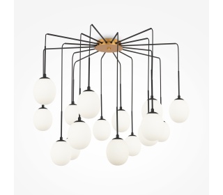 Арматура из металла в двух оттенках: черный и золото. Плафоны из матового выдувного стекла крепятся к металлическим дугам. Высота регулируется с помощью тросов.