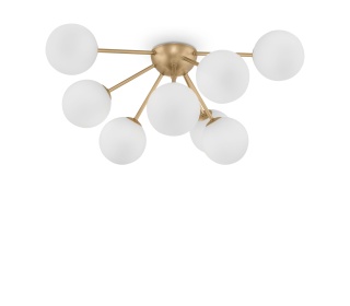 Серия Isabella – прекрасный вариант для современных интерьеров в теплой цветовой гамме. Арматура цвета матового золота выполнена из металла, а плафоны необычной формы – из янтарного стекла. Благодаря небольшой высоте потолочные светильники Isabella можно использовать в помещениях с невысокими потолками. Широкая линейка включает 3 потолочных светильника на 8, 6 и 4 рожка, а также бра.