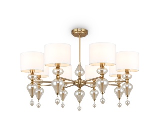 Арматура — металлическая, цвет — латунь. Стеклянные белые плафоны-цилиндры мягко рассеивают свет в стороны. Открытые края плафонов и глянцевая поверхность дают дополнительный свет в вверх и вниз для максимальной освещенности. Источник света — лампа с цоколем Е14.