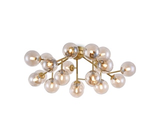Металлическая арматура в четырех цветах: матовый черный, хром, золото, латунь. Плафоны — выдувное стекло. Цвета — дымчатый, янтарный, коньячный. Дизайн с имитацией молекулярной структуры. Высота подвесных светильников регулируется тросом. Лампа с цоколем G9.