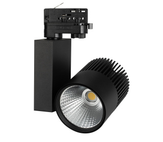 Светильник подвесной для треков/шин 4 провода с управлением DALI. Мощность 40Вт, св. поток 2800 лм, 70 лм/Вт, дневной 4000 К, угол 24°, CRI>80, напряжение питания 230 В. Черный круглый корпус из алюминия, материал линзы PC/PMMA , степень защиты IP20. Размер: диаметр 100 мм, высота 195 мм. Монтаж на трек 3-фазный. Драйвер встроенный 9-47 В, 500 мА., пульсация <5%.