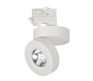 Светильник подвесной откидной для треков/шин 4 провода, 12Вт. Цвет свечения БЕЛЫЙ 5000K, световой поток 770лм, CRI>90, угол свечения 24°, угол поворота 355°, угол наклона 90°. Корпус круглый, металл, цвет белый, IP40. Размер DxH Ø100×105мм. Питание AC 220-240V, 12Вт, драйвер встроенный (DC 300mA, 25-42V).