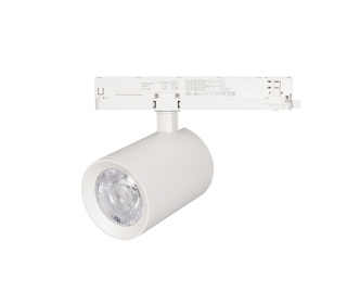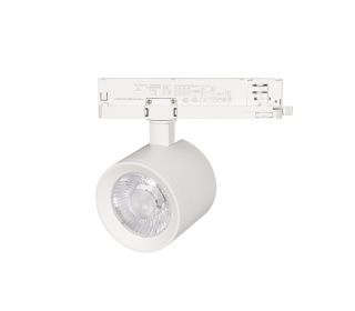 Светильник подвесной для треков/шин 4 провода, 20Вт. Цвет свечения БЕЛЫЙ ТЕПЛЫЙ 3000K, световой поток 1990лм, угол 24°, CRI>90. Корпус круглый, металл, цвет белый, IP20. Размеры DxH Ø100×80мм. Входное напряжение AC220-240V, мощность 20Вт. Драйвер встроенный в адаптер (30-40V, 450mA).